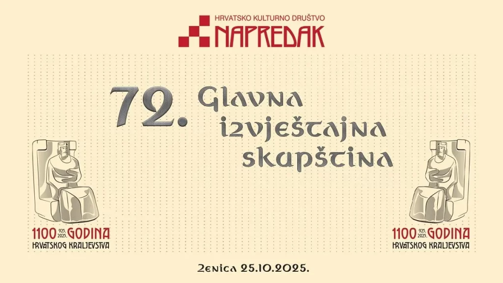 Hrvatsko kulturno društvo Napredak održat će svoju 72. Glavnu izvještajnu skupštinu u subotu, 25. listopada 2025. godine u Zenici, u Hrvatskom domu „Kralj Tomislav“.