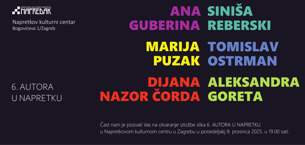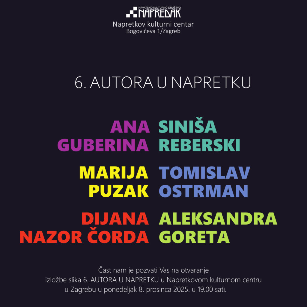 Pozivamo Vas na Adventsku izložbu pod nazivom „6 AUTORA U NAPRETKU“ na kojoj sudjeluju slikari koji su u proteklom periodu održali svoje samostalne izložbe u Galeriji Napredak u Napretkovom kulturnom centru u Zagrebu.