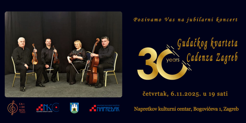 Pozivamo Vas na jubilarni koncert Gudačkog kvarteta Cadenza Zagreb povodom 30 godišnjice djelovanja koji će se održati u četvrtak, 6. studenoga 2025. godine u dvorani HKD Napredak – Napretkovog kulturnog centra u Zagrebu, Bogovićeva 1/I s početkom u 19 sati.
