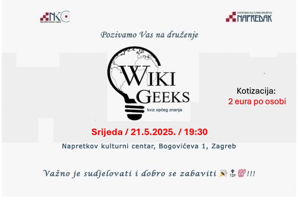 Najavljujemo naš svibanjski WikiGeeks kviz koji će se održati u prostorijama Napretkovog kulturnog centra.